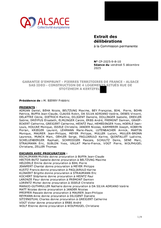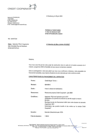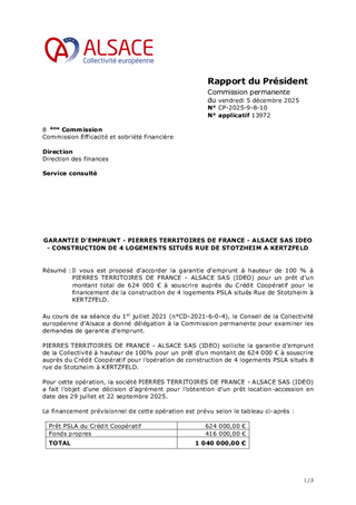 Il vous est proposé d’accorder la garantie d'emprunt à hauteur de 100 % à PIERRES TERRITOIRES DE FRANCE - ALSACE SAS (IDEO) pour un prêt d’un montant total de 624 000 € à souscrire auprès du Crédit Coopératif pour le financement de la construction de 4 logements PSLA situés Rue de Stotzheim à KERTZFELD.
