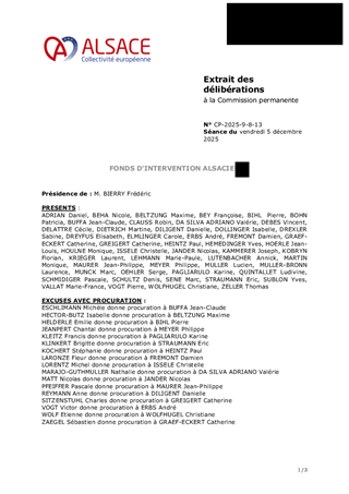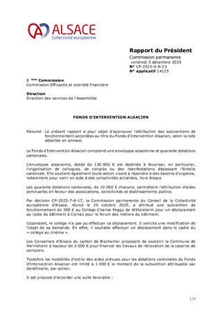 Le présent rapport a pour objet d'approuver l'attribution des subventions de fonctionnement accordées au titre du Fonds d'Intervention Alsacien, selon la liste détaillée en annexe.