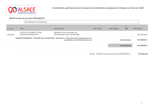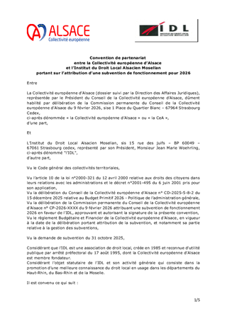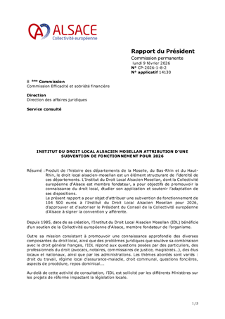 Produit de l’histoire des départements de la Moselle, du Bas-Rhin et du Haut-Rhin, le droit local alsacien-mosellan est un élément structurant de l’identité de ces départements. L'Institut du Droit Local Alsacien Mosellan, dont la Collectivité européenne d’Alsace est membre fondateur, a pour objectifs de promouvoir la connaissance du droit local, étudier son application et soutenir l’adaptation de ses dispositions. Le présent rapport a pour objet d'attribuer une subvention de fonctionnement de 104 500 euros à l'Institut du Droit Local Alsacien Mosellan pour 2026, d'approuver et d'autoriser le Président du Conseil de la Collectivité européenne d'Alsace à signer la convention y afférente.