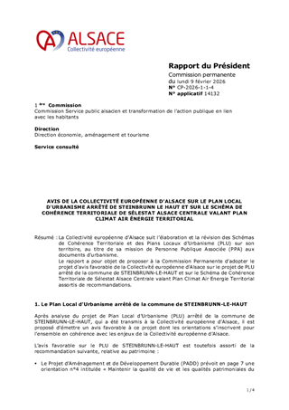 La Collectivité européenne d’Alsace suit l’élaboration et la révision des Schémas de Cohérence Territoriale et des Plans Locaux d'Urbanisme (PLU) sur son territoire, au titre de sa mission de Personne Publique Associée (PPA) aux documents d'urbanisme. Le rapport a pour objet de proposer à la Commission Permanente d'adopter le projet d'avis favorable de la Collectivité européenne d'Alsace sur le projet de PLU arrêté de la commune de STEINBRUNN-LE-HAUT et sur le Schéma de Cohérence Territoriale de Sélestat Alsace Centrale valant Plan Climat Air Energie Territorial assortis de recommandations.