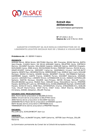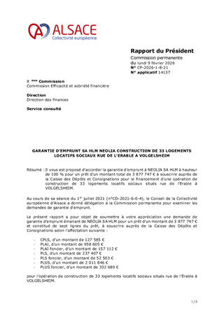 Il vous est proposé d’accorder la garantie d'emprunt à NEOLIA SA HLM à hauteur de 100 % pour un prêt d’un montant total de 3 877 747 € à souscrire auprès de la Caisse des Dépôts et Consignations pour le financement d'une opération de construction de 33 logements locatifs sociaux situés rue de l’Erable à VOLGELSHEIM.