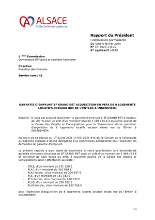 Il vous est proposé d’accorder la garantie d'emprunt à 3F GRAND EST à hauteur de 100 % pour un prêt d’un montant total de 1 469 165 € à souscrire auprès de la Caisse des Dépôts et Consignations pour le financement d'une opération d’acquisition de 8 logements locatifs sociaux situés rue de l’Entlen à INGERSHEIM.