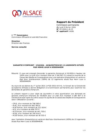 Il vous est proposé d’accorder la garantie d'emprunt à VILOGIA à hauteur de 100% pour un prêt d’un montant total de 3 186 967 € à souscrire auprès de la Caisse des Dépôts et Consignations pour une opération d’acquisition en vente en état futur d'achèvement (VEFA) de 13 logements situés Rue Henri Loux à SESSENHEIM.