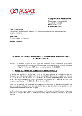 Le présent rapport a pour objet de proposer à la Commission permanente d'approuver l'attribution de subventions d'investissement au titre du Fonds de Solidarité Territoriale (FST) pour un montant total de 61 813 €.