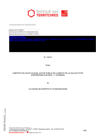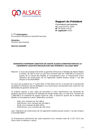 Il vous est proposé d’accorder la garantie d'emprunt à Habitats de Haute-Alsace à hauteur de 100 % pour un prêt d’un montant total de 1 989 000 € à souscrire auprès de la Caisse des Dépôts et Consignations pour le financement d'une opération de construction de 23 logements locatifs sociaux situés 1 rue des Vergers à VILLAGE-NEUF.