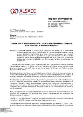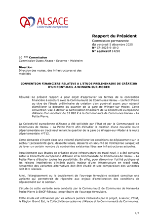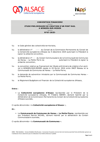Le présent rapport a pour objet d’approuver les termes de la convention financière à conclure avec la Communauté de Communes Hanau – La Petit Pierre au titre de l’étude préliminaire de création d’un pont-rail ayant pour objectif d’améliorer la desserte du quartier de la gare de Wingen-sur Moder. Cette convention vise à définir la participation financière de la Collectivité européenne d'Alsace d'un montant de 33 890 € à la Communauté de Communes Hanau - La Petite Pierre.