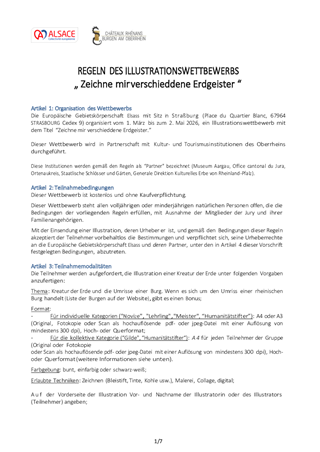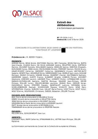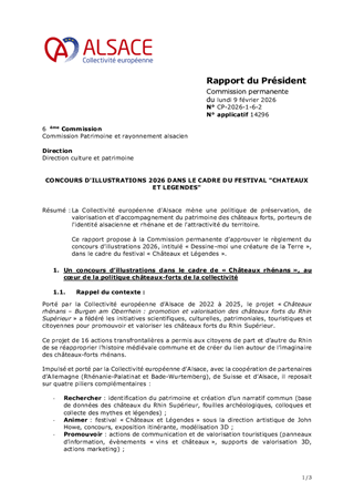 La Collectivité européenne d'Alsace mène une politique de préservation, de valorisation et d'accompagnement du patrimoine des châteaux forts, porteurs de l'identité alsacienne et rhénane et de l'attractivité du territoire. Ce rapport propose à la Commission permanente d’approuver le règlement du concours d’illustrations 2026, intitulé « Dessine-moi une créature de la Terre », dans le cadre du festival « Châteaux et Légendes ».