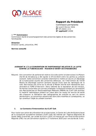Une convention de partenariat relative à la lutte contre la tuberculose à la Maison d’arrêt de Strasbourg a été signée le 07/12/2023 entre les parties au présent avenant. Cette convention consiste notamment à mettre en œuvre un dépistage de la tuberculose auprès des personnes détenues, via l’intervention de l’Unité Mobile de Dépistage (camion sanitaire équipé d’une salle de radiologie) de la CeA. Des travaux de voirie sur le site de la Maison d'arrêt sont nécessaires pour permettre à l'UMD d'intervenir. Dans l’attente de la réalisation de ces travaux, les Parties concernées ont convenu d’adapter le dispositif existant en permettant aux Manipulatrices en Electroradiologie Médicale (MERM) du CLAT CeA d'utiliser le matériel radiologique présent sur place dans les locaux du service de santé afin d’assurer la réalisation des radiographies de contrôle au sein du centre pénitentiaire. La convention actuelle doit donc être modifiée en conséquence, ce qui constitue l’objet du présent avenant.