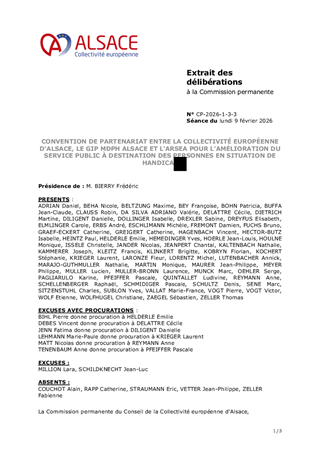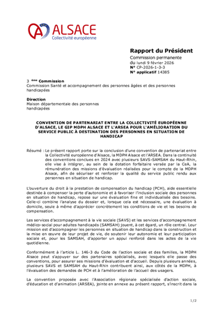 Le présent rapport porte sur la conclusion d’une convention de partenariat entre la Collectivité européenne d’Alsace, la MDPH Alsace et l’ARSEA. Dans la continuité des conventions conclues en 2024 avec plusieurs SAVS-SAMSAH du Haut-Rhin, elle vise à intégrer, au sein de la dotation forfaitaire versée par la CeA, la rémunération des missions d’évaluation réalisées pour le compte de la MDPH Alsace, afin de sécuriser et renforcer la qualité du service public rendu aux personnes en situation de handicap.
