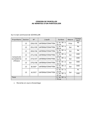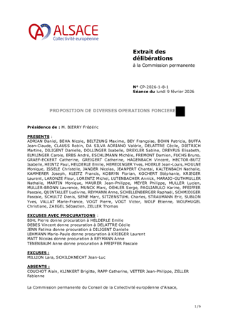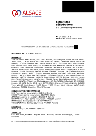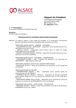 Le présent rapport a pour objet de proposer à la Commission permanente diverses opérations foncières nécessitant des évolutions foncières : TERRITOIRE OUEST ALSACE - SAVERNE - MOLSHEIM - GOUGENHEIM (67270) - RD31/RD61 - Acquisition d’une parcelle auprès d’un particulier au prix de 43,05 € - ROTHAU (67570) - Acquisition d’une maison dans le cadre du projet d’aménagement de la RD1420 - COLROY-LA-ROCHE (67420) – RD1420 - Acquisition d’une parcelle auprès d’un particulier au prix de 2 800,00 € TERRITOIRE NORD ALSACE - HAGUENAU - WISSEMBOURG - LEUTENHEIM (67480) – A35 - Transfert de parcelles à la Commune de LEUTENHEIM – Régularisation d’écriture TERRITOIRE CENTRE ALSACE ET DE L'EQUITE TERRITORIALE - GOXWILLER (67210) – Vente de 8 parcelles à un particulier au prix global de 24 402,60 € TERRITORE REGION DE COLMAR - DURRENENTZEN (68320) – RD4 – Acquisition d’une parcelle après de particuliers au prix de 936,80 € - GRIESBACH-AU-VAL (68140) – RD10 IV - Acquisition de plusieurs emprises d'une surface totale de 1,21 are auprès de riverains pour un prix total de 3 327,15 € - REGUISHEIM (68890) RD2 et RD50 - Acquisition d'une parcelle de 3,40 ares auprès de la Commune de REGUISHEIM à l'euro symbolique TERRITOIRE SUD ALSACE – SAINT-LOUIS – THUR-DOLLER - HESINGUE (68220) – RD419 - Vente d'une parcelle au profit de la Commune d’HESINGUE au prix de 1 845 €