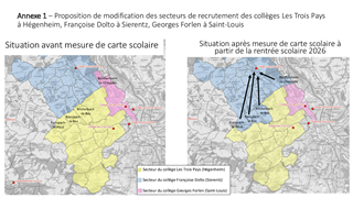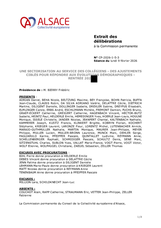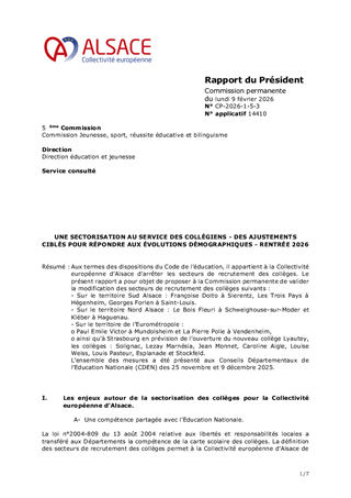 Aux termes des dispositions du Code de l’éducation, il appartient à la Collectivité européenne d’Alsace d’arrêter les secteurs de recrutement des collèges. Le présent rapport a pour objet de proposer à la Commission permanente de valider la modification des secteurs de recrutement des collèges suivants : - Sur le territoire Sud Alsace : Françoise Dolto à Sierentz, Les Trois Pays à Hégenheim, Georges Forlen à Saint-Louis. - Sur le territoire Nord Alsace : Le Bois Fleuri à Schweighouse-sur-Moder et Kléber à Haguenau. - Sur le territoire de l’Eurométropole : o Paul Emile Victor à Mundolsheim et La Pierre Polie à Vendenheim, o ainsi qu’à Strasbourg en prévision de l’ouverture du nouveau collège Lyautey, les collèges : Solignac, Lezay Marnésia, Jean Monnet, Caroline Aigle, Louise Weiss, Louis Pasteur, Esplanade et Stockfeld. L’ensemble des mesures a été présenté aux Conseils Départementaux de l’Education Nationale (CDEN) des 25 novembre et 9 décembre 2025.