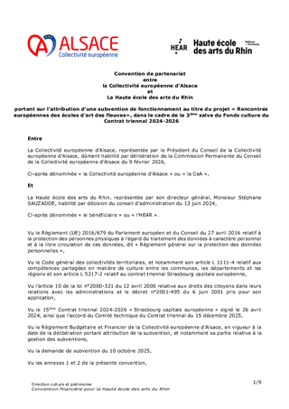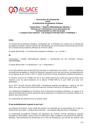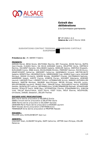La Collectivité européenne d'Alsace est fortement engagée dans la défense de l’ambition que porte Strasbourg en tant que capitale européenne, à la fois siège des institutions européennes, cœur historique et politique de l’Europe et ville internationale des droits de l’Homme, et plus globalement engagée dans le rayonnement de l'Alsace en Europe et la promotion des valeurs européennes et humanistes en Alsace. Dans le cadre du 15ème Contrat triennal Strasbourg Capitale européenne 2024- 2026, les signataires (Etat, Région Grand Est, Collectivité européenne d’Alsace, Eurométropole et Ville de Strasbourg) ont souhaité reconduire les dispositifs d'appel à projets et le soutien à un ensemble de projets structurants visant à améliorer l’accessibilité, l'attractivité et le rayonnement international de Strasbourg. Ce rapport propose d’attribuer une série de subventions de fonctionnement et d’investissement aux projets retenus dans le cadre des appels à projets du Contrat triennal pour un montant total de 271 500 €. Les 17 projets présentés dans ce rapport visent à faire de Strasbourg et de l’Alsace des territoires de référence au niveau européen dans les domaines de la culture, de la démocratie, de la citoyenneté, des droits humains, de la recherche et de l’innovation, de par leur dimension européenne, voire internationale, et en permettant une appropriation de la cause européenne par le plus grand nombre.