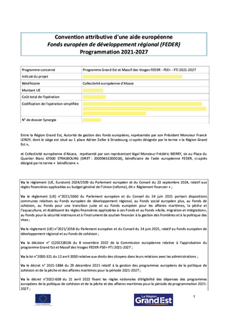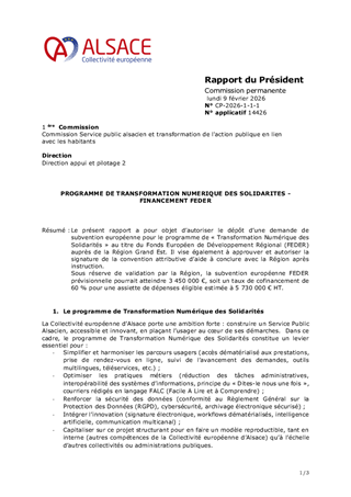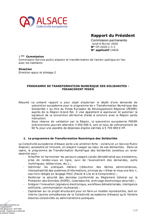 Le présent rapport a pour objet d’autoriser le dépôt d’une demande de subvention européenne pour le programme de « Transformation Numérique des Solidarités » au titre du Fonds Européen de Développement Régional (FEDER) auprès de la Région Grand Est. Il vise également à approuver et autoriser la signature de la convention attributive d’aide à conclure avec la Région après instruction. Sous réserve de validation par la Région, la subvention européenne FEDER prévisionnelle pourrait atteindre 3 450 000 €, soit un taux de cofinancement de 60 % pour une assiette de dépenses éligible estimée à 5 730 000 € HT.