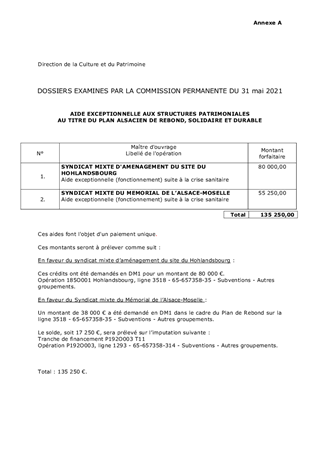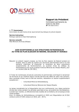 Le présent rapport propose, au titre du Plan alsacien de Rebond solidaire et durable, dans le cadre du soutien aux structures patrimoniales suite à la crise sanitaire, d’attribuer et d’autoriser le versement de deux subventions exceptionnelles de fonctionnement, au syndicat mixte du château du Hohlandsbourg ainsi qu’au syndicat mixte du Mémorial de l’Alsace-Moselle, pour un montant total de 135 250 €.