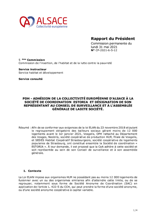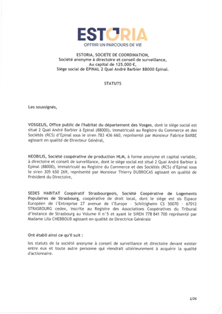 Afin de se conformer aux exigences de la loi ELAN du 23 novembre 2018 stipulant le regroupement obligatoire des bailleurs sociaux gérant moins de 12 000 logements avant le 1er janvier 2021, Vosgelis, OPH rattaché au Département des Vosges, Neobilis, société coopérative de production HLM, filiale de Vosgelis, et SEDES Habitat Coopératif Strasbourgeois, société coopérative de logements populaires de Strasbourg, ont constitué ensemble la Société de coordination « ESTORIA ». À leur demande, il est proposé que la CeA adhère à cette société et soit représentée au sein de son Conseil de surveillance et à son assemblée générale.