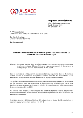 Il vous est soumis, dans le présent rapport, les propositions de subventions de fonctionnement pour 12 associations ou organismes relevant du domaine de la Santé publique pour un montant total de 471 200 €.