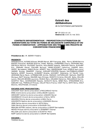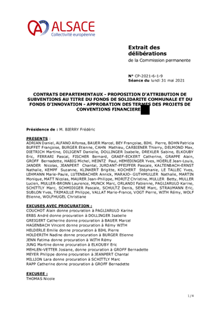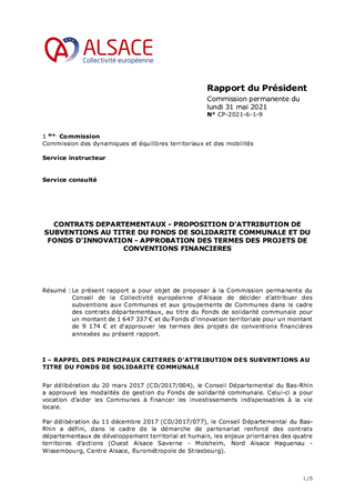 Le présent rapport a pour objet de proposer à la Commission permanente du Conseil de la Collectivité européenne d'Alsace de décider d'attribuer des subventions aux Communes et aux groupements de Communes dans le cadre des contrats départementaux, au titre du Fonds de solidarité communale pour un montant de 1 647 337 € et du Fonds d'innovation territoriale pour un montant de 9 174 € et d'approuver les termes des projets de conventions financières annexées au présent rapport.