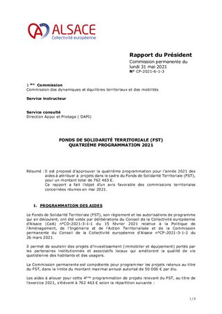 Il est proposé d’approuver la quatrième programmation pour l’année 2021 des aides à attribuer à projets dans le cadre du Fonds de Solidarité Territoriale (FST), pour un montant total de 762 463 €. Ce rapport a fait l’objet d’un avis favorable des commissions territoriales concernées réunies en mai 2021.