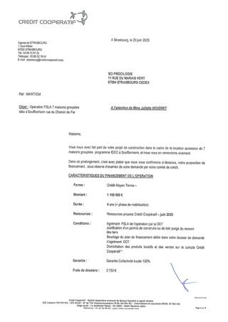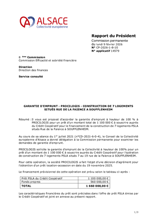 Il vous est proposé d’accorder la garantie d'emprunt à hauteur de 100 % à PROCILOGIS pour un prêt d’un montant total de 1 100 000 € à souscrire auprès du Crédit Coopératif pour le financement de la construction de 7 logements PSLA situés Rue de la Faïence à SOUFFLENHEIM.