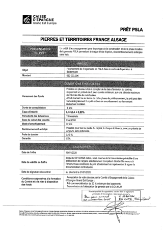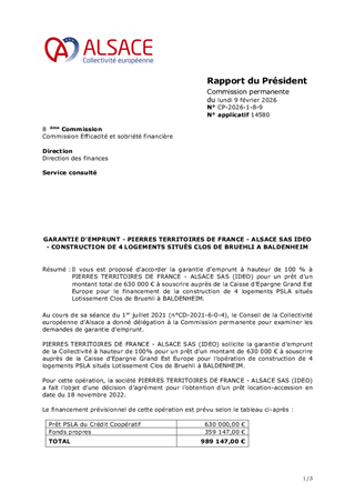 Il vous est proposé d’accorder la garantie d'emprunt à hauteur de 100 % à PIERRES TERRITOIRES DE FRANCE - ALSACE SAS (IDEO) pour un prêt d’un montant total de 630 000 € à souscrire auprès de la Caisse d’Epargne Grand Est Europe pour le financement de la construction de 4 logements PSLA situés Lotissement Clos de Bruehli à BALDENHEIM.