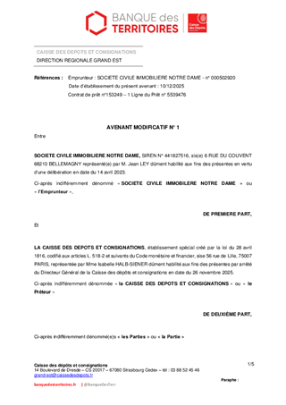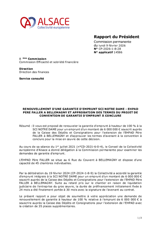 Il vous est proposé de renouveler la garantie d'emprunt à hauteur de 100 % à la SCI NOTRE DAME pour un emprunt d’un montant de 6 000 000 € souscrit auprès de la Caisse des Dépôts et Consignations pour l’extension de l’EHPAD Père FALLER à BELLEMAGNY et d’approuver les termes d’avenant à la convention à conclure pour la mise en œuvre de cette décision.