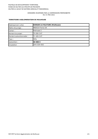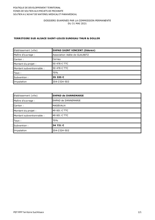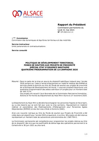 Dans le cadre de la mise en œuvre du dispositif spécifique instauré pour l’année 2020 portant sur l’aide à l’achat d’équipement en matériel médical des EHPAD et services d’aide à domicile au titre du Fonds de soutien aux projets de proximité de la Politique de Développement territorial, il vous est proposé d’approuver une quatrième programmation des aides à attribuer à 4 projets pour un montant total de 168 713 €. Ces projets ont recueilli l’avis favorable de la Commission Patrimoine Immobilier, Actions et Territoires du Département du Haut-Rhin réunie le 27 novembre 2020.