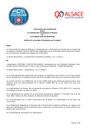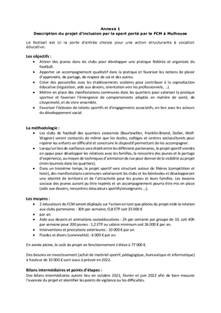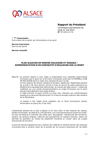 Le présent rapport a pour objet la présentation d’un dispositif expérimental d’inclusion par le sport sur le territoire mulhousien porté par le FOOTBALL CLUB DE MULHOUSE dans le cadre d’un partenariat avec la CeA. Le Plan alsacien de rebond, solidaire et durable, adopté par l’Assemblée plénière de la CeA le 26 mars dernier prévoit la mise en œuvre de cette expérience au bénéfice de la jeunesse dès cette année. Au travers de cette action, il s’agira de modéliser sur une année d’expérimentation un projet d’inclusion par le sport pouvant être déployé à plus large échelle. Il s’agit d’utiliser le sport comme un levier pour répondre aux problématiques sociales d’un panel de 200 jeunes de 7 à 15 ans et les aider à devenir des citoyens de la République. Le dossier a fait l'objet d'une validation par la 7ème Commission (santé, alimentation et sport) du 3 mai 2021.