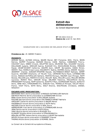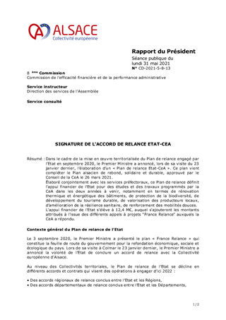 Dans le cadre de la mise en œuvre territorialisée du Plan de relance engagé par l’Etat en septembre 2020, le Premier Ministre a annoncé, lors de sa visite du 23 janvier dernier, l’élaboration d’un « Plan de relance Etat-CeA ». Ce plan vient compléter le Plan alsacien de rebond, solidaire et durable, approuvé par le Conseil de la CeA le 26 mars 2021. Élaboré conjointement avec les services préfectoraux, ce Plan de relance définit l’appui financier de l’Etat pour des études et des travaux programmés par la CeA dans les deux années à venir, notamment en termes de rénovation thermique et énergétique des bâtiments, de protection de la biodiversité, de développement du tourisme durable, de valorisation des producteurs locaux, d’amélioration de la résilience sanitaire, de renforcement des mobilités douces. L'appui financier de l'Etat s'élève à 12,4 M€, auquel s'ajouteront les montants attribués à l'issue des différents appels à projets "France Relance" auxquels la CeA a répondu.