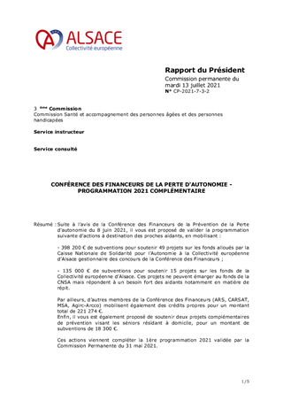 Suite à l’avis de la Conférence des Financeurs de la Prévention de la Perte d’autonomie du 8 juin 2021, il vous est proposé de valider la programmation suivante d’actions à destination des proches aidants, en mobilisant : - 398 200 € de subventions pour soutenir 49 projets sur les fonds alloués par la Caisse Nationale de Solidarité pour l’Autonomie à la Collectivité européenne d’Alsace gestionnaire des concours de la Conférence des Financeurs ; - 135 000 € de subventions pour soutenir 15 projets sur les fonds de la Collectivité européenne d’Alsace. Ces projets ne peuvent émarger au fonds de la CNSA mais répondent à un besoin fort des aidants notamment en matière de répit. Par ailleurs, d’autres membres de la Conférence des Financeurs (ARS, CARSAT, MSA, Agirc-Arcco) mobilisent également des crédits propres pour un montant total de 221 274 €. Enfin, il vous est également proposé de soutenir deux projets complémentaires de prévention visant les séniors résidant à domicile, pour un montant de subventions de 18 300 €. Ces actions viennent compléter la 1ère programmation 2021 validée par la Commission Permanente du 31 mai 2021.