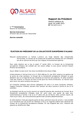 Conformément à l’article L.3122-1 du Code Général des Collectivités Territoriales, le Conseil de la Collectivité européenne d'Alsace élit son Président lors de la réunion de droit qui suit chaque renouvellement général.