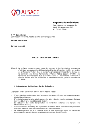 Le présent rapport a pour objet de proposer à la Commission permanente d’attribuer une subvention à l’Association Chantier d’Insertion (ACI) « Les Jardins de la Montagne Verte » dans le cadre d’un projet de jardins solidaires étendu sur le périmètre des Unités Territoriales d’Action Médico–Sociale (UTAMS) des territoires Eurométropole Sud et Centre Alsace : notamment à Ostwald et Erstein, en lien avec les communes et partenaires locaux, pour un montant de 22 380 €.