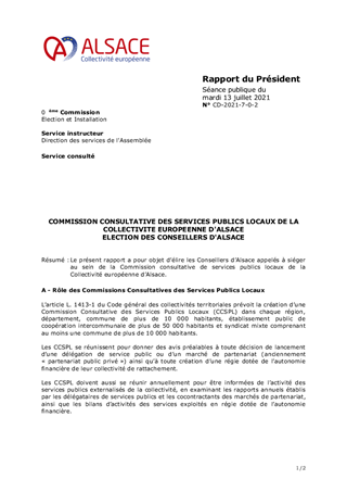 Le présent rapport a pour objet d’élire les Conseillers d’Alsace appelés à siéger au sein de la Commission consultative de services publics locaux de la Collectivité européenne d’Alsace.