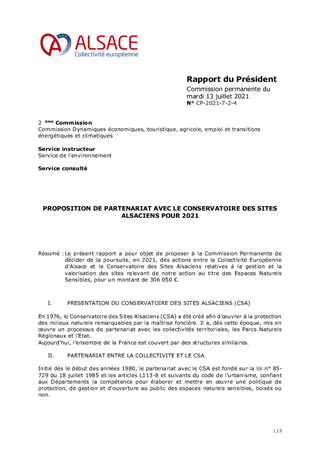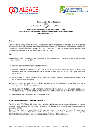 Le présent rapport a pour objet de proposer à la Commission Permanente de décider de la poursuite, en 2021, des actions entre la Collectivité Européenne d’Alsace et le Conservatoire des Sites Alsaciens relatives à la gestion et la valorisation des sites relevant de notre action au titre des Espaces Naturels Sensibles, pour un montant de 306 050 €.