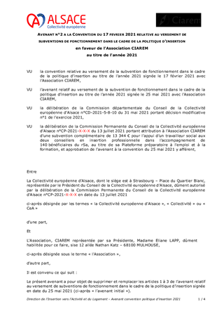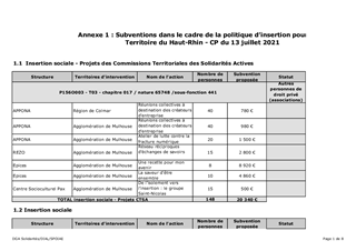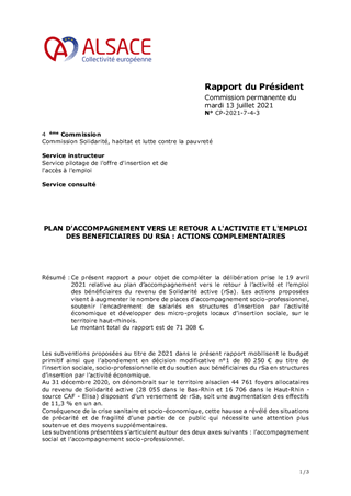 Ce présent rapport a pour objet de compléter la délibération prise le 19 avril 2021 relative au plan d’accompagnement vers le retour à l’activité et l’emploi des bénéficiaires du revenu de Solidarité active (rSa). Les actions proposées visent à augmenter le nombre de places d’accompagnement socio-professionnel, soutenir l’encadrement de salariés en structures d’insertion par l’activité économique et développer des micro-projets locaux d’insertion sociale, sur le territoire haut-rhinois. Le montant total du rapport est de 71 308 €.