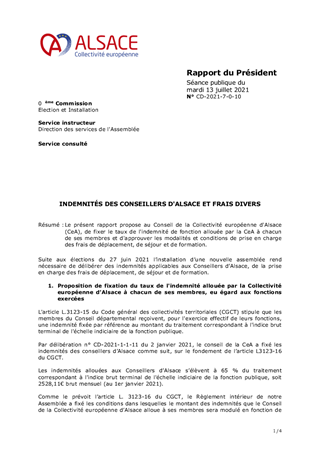 Le présent rapport propose au Conseil de la Collectivité européenne d'Alsace (CeA), de fixer le taux de l'indemnité de fonction allouée par la CeA à chacun de ses membres et d'approuver les modalités et conditions de prise en charge des frais de déplacement, de séjour et de formation.