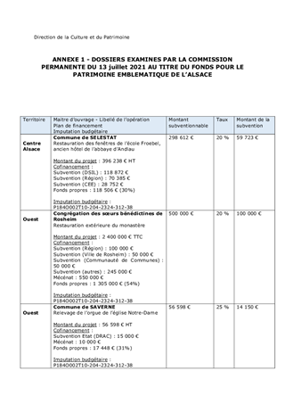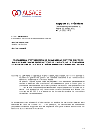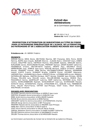 PROPOSITION D'ATTRIBUTION DE SUBVENTIONS AU TITRE DU FONDS POUR LE PATRIMOINE EMBLÉMATIQUE DE L'ALSACE, DE LA FONDATION DU PATRIMOINE ET DE L'ASSOCIATION MUSEES MULHOUSE SUD ALSACE