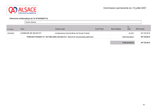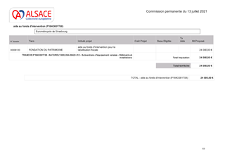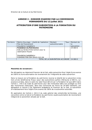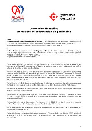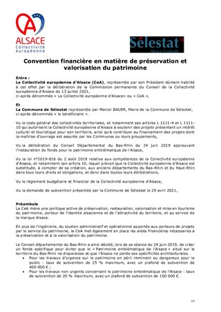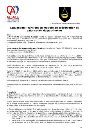 La CeA mène une politique de préservation, restauration, valorisation et mise en tourisme du patrimoine, porteur de l'identité alsacienne et de l'attractivité du territoire, au service de la marque Alsace. Le présent rapport a pour objet de proposer à la Commission permanente de décider d'attribuer des subventions d'investissement pour le Fonds pour le patrimoine emblématique de l'Alsace (FPEA) d'un montant total prévisionnel de 211 085 €, une subvention pour la Fondation du Patrimoine d'un montant de 24 000 €, une subvention pour l'Association musées Mulhouse sud Alsace d'un montant de 15 000 € et d'approuver les termes des projets de conventions financières correspondantes.