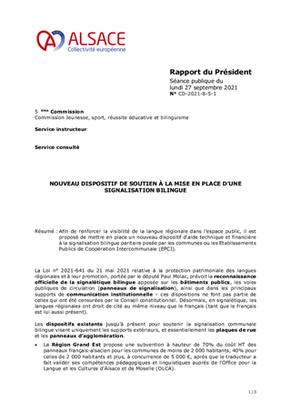 Afin de renforcer la visibilité de la langue régionale dans l’espace public, il est proposé de mettre en place un nouveau dispositif d'aide technique et financière à la signalisation bilingue paritaire posée par les communes ou les Etablissements Publics de Coopération Intercommunale (EPCI).
