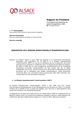 Le présent rapport a pour objet de proposer à la Commission Permanente d'attribuer une subvention de 10 000 € à la Mission Opérationnelle Transfrontalière (MOT) en vue de la réalisation de son programme de travail partenarial qui présente un intérêt fort pour la Collectivité européenne d'Alsace. En effet, la MOT est un outil d’ingénierie pluridisciplinaire et de production d’expertise territoriale transfrontalière de haut niveau régi par le statut d’association qui a pour but de promouvoir et de faciliter le développement des territoires par la réalisation des projets transfrontaliers. Cette subvention s’inscrirait dans une convention-cadre pluriannuelle 2021-2023 déclinée pour l’année 2021 en une convention financière.