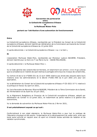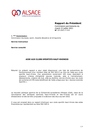 Le présent rapport a pour objet d’approuver une liste de subventions de fonctionnement d’un montant total de 502 925 € au titre de l’aide aux clubs sportifs haut-rhinois. Ces subventions concernent 195 clubs répondant à plusieurs critères d'éligibilité (jeunes licenciés, aide à l'entraînement, déplacements, création de club, aide au diplôme, service d'ordre pour les clubs de cyclisme) et 378 clubs bénéficiant de l’aide unique pour les « Jeunes Licenciés Sportifs ».