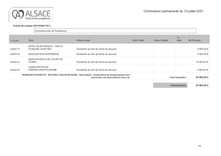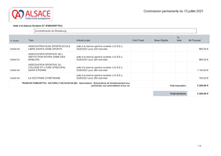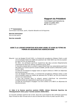 Lors du Budget Primitif 2021, la Collectivité européenne d’Alsace (CeA) a voté une enveloppe totale de crédits de paiement de 4 663 600 € au titre du soutien au sport et à la vie associative. En 2021, les politiques sportives respectives des deux anciens Départements s’appliqueront dans les mêmes conditions qu’en 2020. Il vous est proposé dans le présent rapport d'attribuer aux associations sportives des aides à la licence sportive scolaire UGSEL (année scolaire 2020/2021) prévu au B.P. 2021. Le total de l'enveloppe à engager dans ce rapport s'élève à 3 900 € en dépenses de fonctionnement. Lors du Budget Primitif 2021, la Collectivité européenne d’Alsace (CeA) a voté une enveloppe totale de crédits de paiement de 70 000 € au titre du fonds de secours aux associations. Il vous est proposé dans le présent rapport d'attribuer les subventions exceptionnelles aux associations sportives et culturelles. Le total de l'enveloppe à engager à ce titre s'élève à 41 800 € en dépenses de fonctionnement.