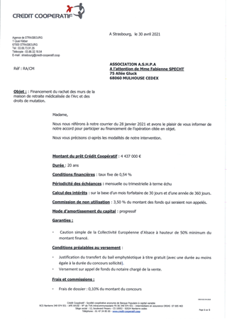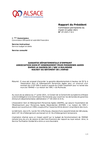 Il vous est proposé d’accorder la garantie départementale à hauteur de 50 % à l’Association Soin et Hébergement Personnes Agées pour un emprunt d’un montant de 4 437 000 € souscrit auprès du Crédit Coopératif pour le rachat des murs de l’EHPAD « La maison de l’ARC » de Mulhouse.