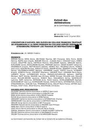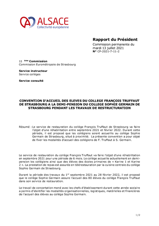Le service de restauration du collège François Truffaut de Strasbourg va faire l’objet d’une réhabilitation entre septembre 2021 et février 2022. Durant cette période, il est proposé que les collégiens soient accueillis au collège Sophie Germain de Strasbourg, situé à proximité. La présente convention a pour objet de fixer les modalités d’accueil des collégiens de F. Truffaut à S. Germain.