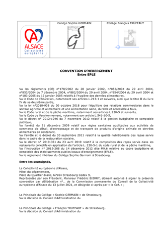 CONVENTION D'ACCUEIL DES ELEVES DU COLLEGE FRANÇOIS TRUFFAUT DE STRASBOURG A LA DEMI-PENSION DU COLLEGE SOPHIE GERMAIN DE STRASBOURG PENDANT LES TRAVAUX DE RESTRUCTURATION