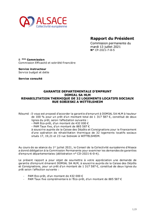 Il vous est proposé d’accorder la garantie d'emprunt à DOMIAL SA HLM à hauteur de 100 % pour un prêt d’un montant total de 1 317 587 €, constitué de deux lignes du prêt, selon l’affectation suivante : - PAM Eco-prêt, d’un montant de 432 000 € - PAM Taux fixe, d’un montant de 885 587 € à souscrire auprès de la Caisse des Dépôts et Consignations pour le financement d'une opération de réhabilitation thermique de 32 logements locatifs sociaux situés 17, 19,21 et 23 rue Sobieski à WITTELSHEIM.