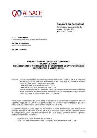 Il vous est proposé d’accorder la garantie d'emprunt à DOMIAL SA HLM à hauteur de 100 % pour un prêt d’un montant total de 1 036 115 €, constitué de deux lignes du prêt, selon l’affectation suivante : - PAM Eco-prêt, d’un montant de 312 000 € - PAM Taux fixe, d’un montant de 724 115 € à souscrire auprès de la Caisse des Dépôts et Consignations pour le financement d'une opération de réhabilitation thermique de 24 logements locatifs sociaux situés 22,24 et 26 rue Sobieski à WITTELSHEIM.