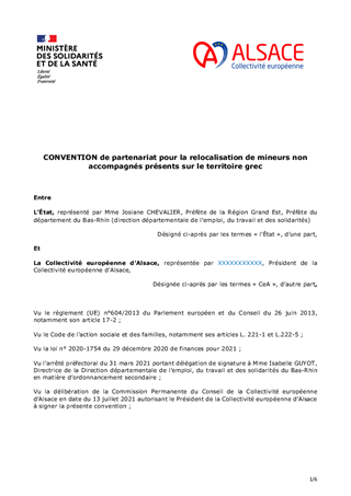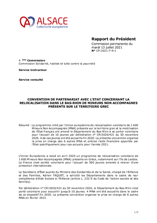 Le programme initié par l'Union européenne de relocalisation volontaire de 1 600 Mineurs Non Accompagnés (MNA) présents sur le territoire grec et la mobilisation de l’Etat français ont amené le Département du Bas-Rhin à se porter volontaire pour l’accueil de 10 jeunes par délibération n° CP/2020/421 du 30 novembre 2020. 4 de ces jeunes ont été accueillis fin 2020. La présente convention organise la prise en charge des 6 autres MNA et précise l’aide financière apportée par l’Etat spécifiquement pour ces accueils pour l’année 2021.