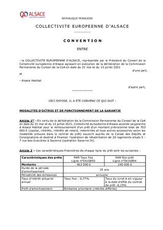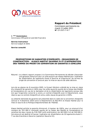 Le présent rapport propose à la Commission Permanente de décider d’accorder une garantie d’emprunt pour un prêt souscrit par Alsace Habitat pour l’opération de réhabilitation de logements situés à Saverne et d’approuver les termes du projet de convention à conclure pour la mise en œuvre de cette décision.