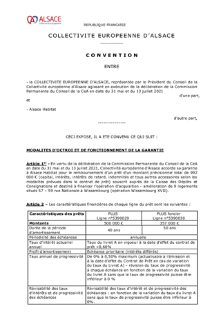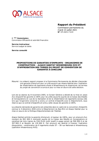 Le présent rapport propose à la Commission Permanente de décider d’accorder une garantie d’emprunt pour un prêt souscrit par Alsace Habitat pour l’opération de réhabilitation de logements situés à Wissembourg et d’approuver les termes du projet de convention à conclure pour la mise en œuvre de cette décision.