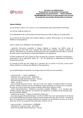 PROPOSITIONS DE GARANTIES D'EMPRUNTS - ORGANISMES DE CONSTRUCTION -ALSACE HABITAT WISSEMBOURG XVII ET D'APPROBATION DES TERMES DU PROJET DE CONVENTION DE GARANTIE À CONCLURE